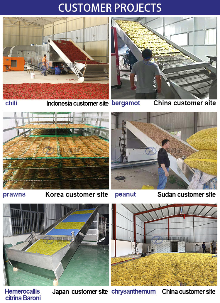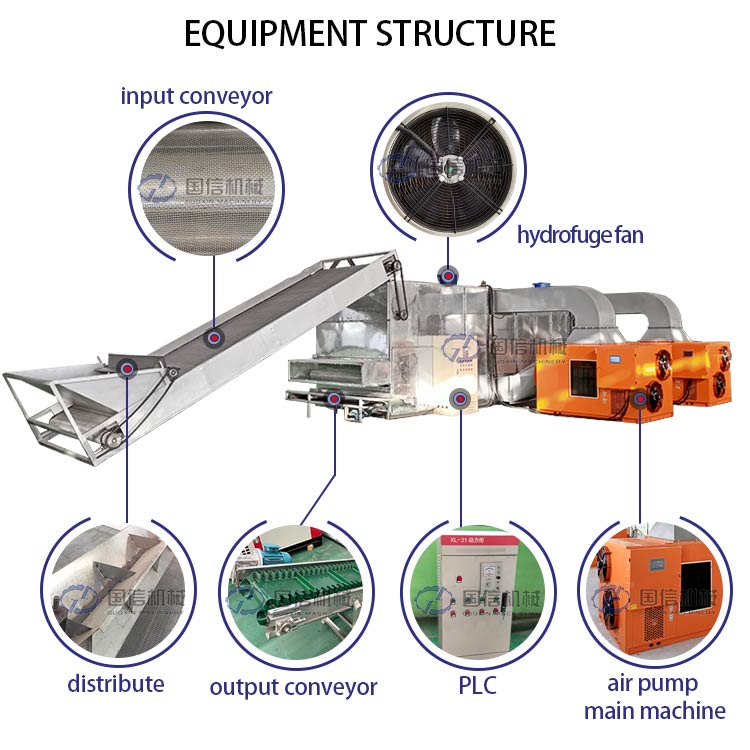 The raw material is conveyed into the coal mesh belt dryer through the feed conveyor. The material is transferred from the first layer to the last layer through the conveyor belt, and the dried material is conveyed by the discharge conveyor. The charcoal briquette dryer uses hot air as the drying medium. The hot air passes through the material from the bottom to the top. Finally, the moisture is discharged from the top of the dryer.