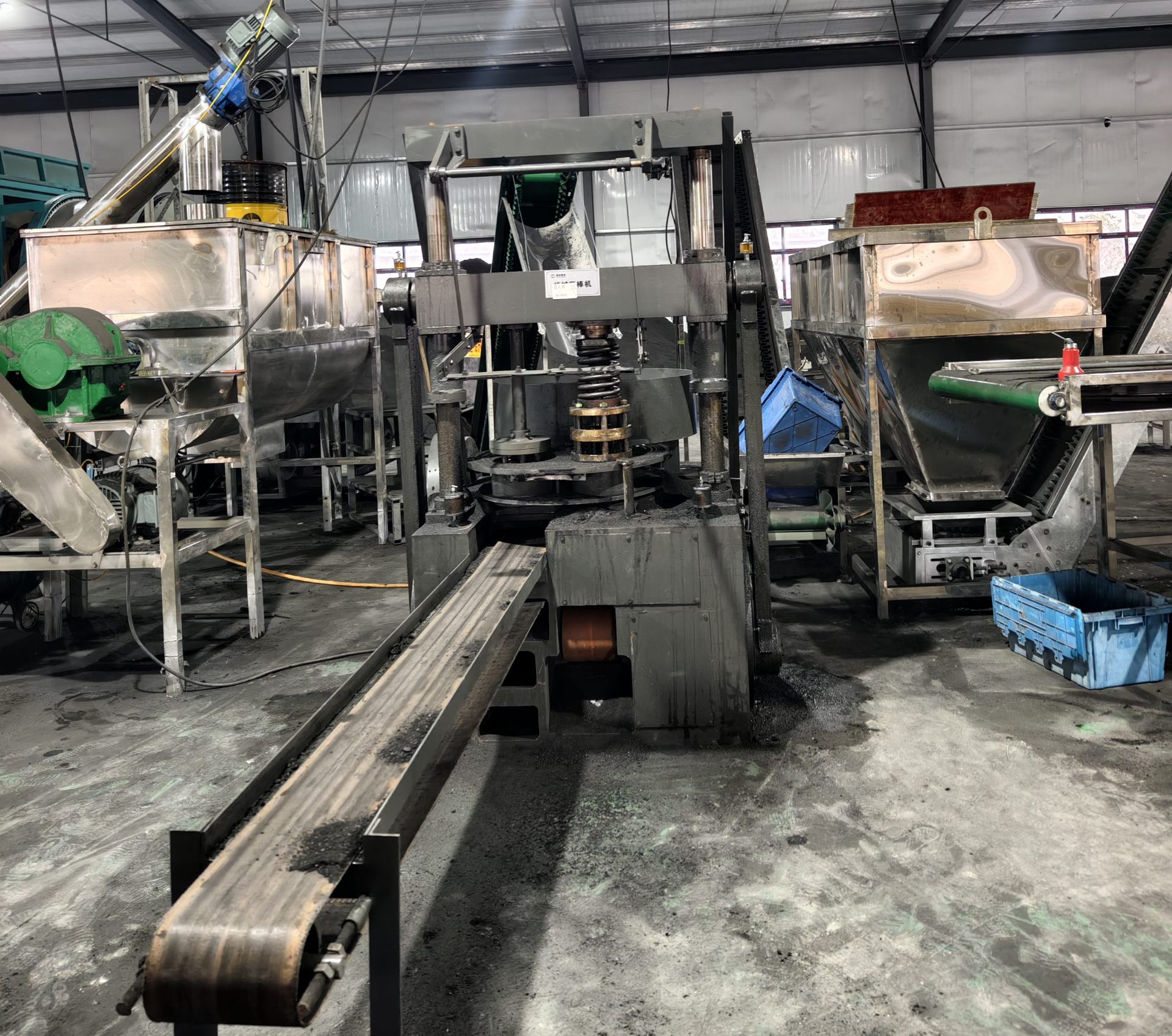 High-Pressure Briquetting Press: A heavy-duty mechanical press for coal powder, utilizing reinforced rollers to ensure high-density molding for industrial fuel.